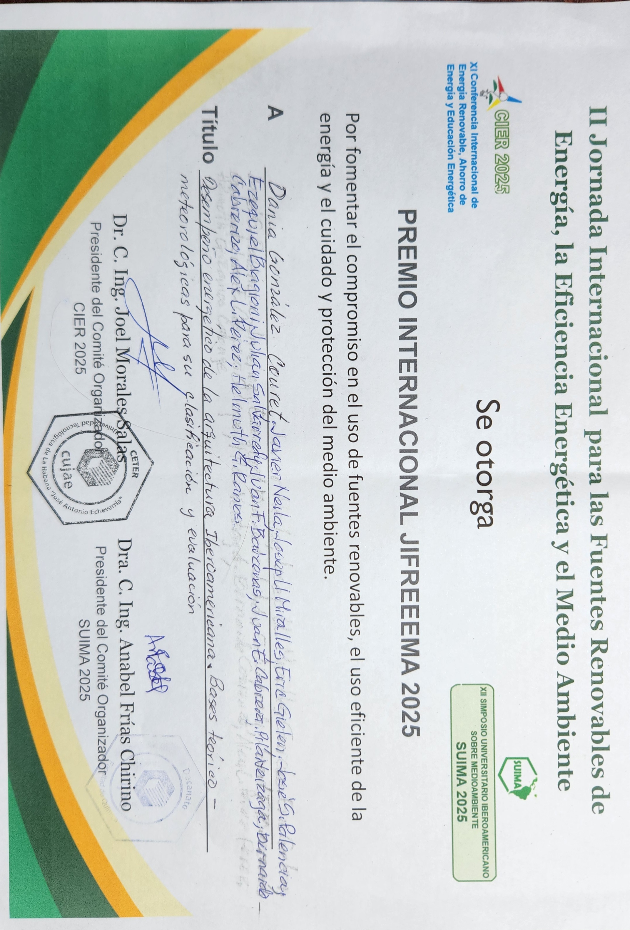 La ponencia totulada "Desempeño energético de la Arqquitectura Iveroamericana. Bases teórico - metodológicas paa su clasificación y evaluación" que recoge los resultados de la primera etaapa de trabaajo de la red en 2024 se presentó como ponencia a la Jornada Internacional de Fuentes Renovables de Energía, Eficiencia Energética y Medio Ambiente (JIFREMA) y recibió Premio a la mejor Ponencia en el VI TALLER INTERNACIONAL DE AHORRO, EFICIENCIA Y GESTION ENERGÉTICA.