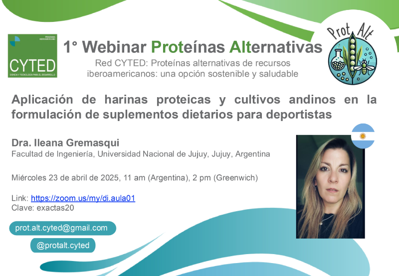 El título de dicho webinar es: "Aplicación de harinas proteicas y cultivos andinos en la formulación de suplementos dietarios para deportistas", y será disertado por la Dra. Ileana Gremasqui, de la Facultad de Ingenieria, Universidad Nacional de Jujuy, Jujuy, Argentina.