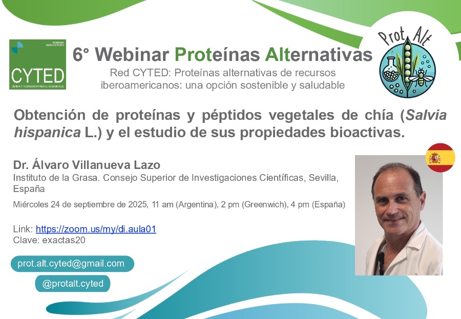 El próximo miércoles 24 de septiembre de 2025 a las 11 am (Argentina), 2 pm (Greenwich), 4 pm (España), del sexto webinar organizado por la Red CYTED Prot-Alt: Proteínas alternativas de recursos iberoamericanos: una opcio?n sostenible y saludable.