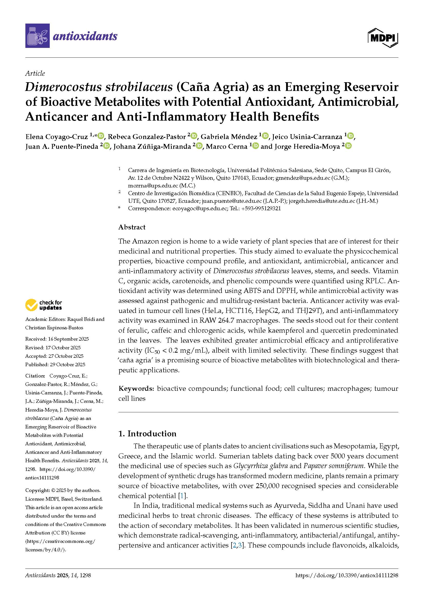 Dimerocostus strobilaceus (Caña Agria) as an Emerging Reservoir of BioactiveMetabolites with Potential Antioxidant, Antimicrobial, Anticancer and Anti-Inflammatory Health Benefits