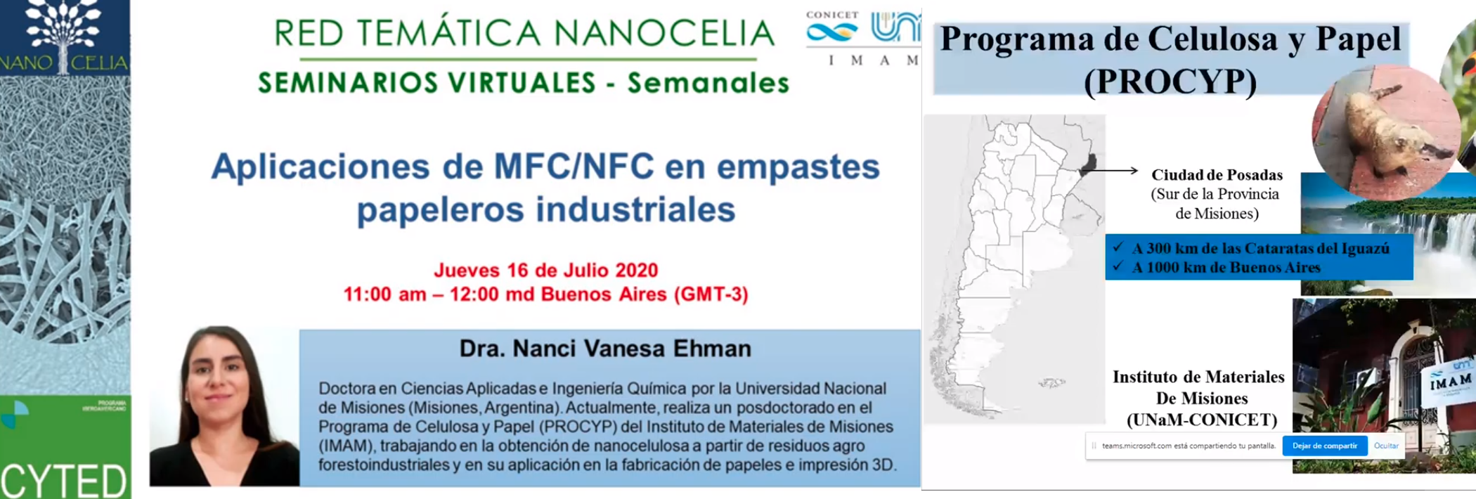 Seminario presentado por la Dra. Nanci Vanesa Ehman, Doctora en Ciencias Aplicadas e Ingeniería Química por la Universidad Nacional de Misiones (Misiones, Argentina). Actualmente, realiza un posdoctorado en el Programa de Celulosa y Papel (PROCYP) del Instituto de Materiales de Misiones (IMAM), trabajando en la obtención de nanocelulosa a partir de residuos agro forestoindustriales y en su aplicación en la fabricación de papeles e impresión 3D. La sesión fue presidida por el Dr. Marc Delgado-Aguilar (LEPAMAP, Universidad de Girona, España.