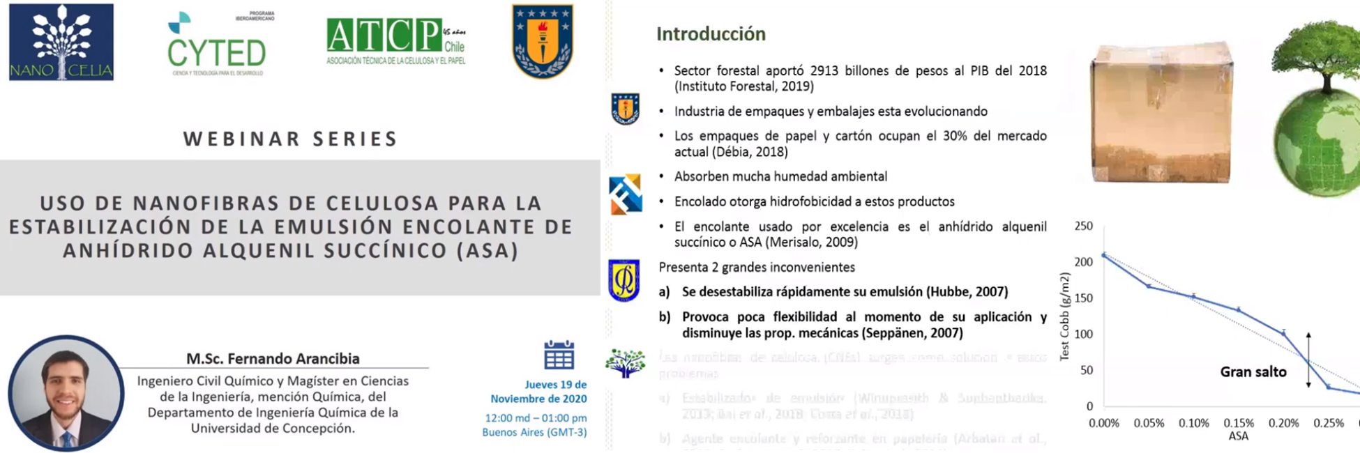 Seminario Virtual "Uso de nanofibras de celulosa para la estabilización de la emulsión encolante de anhídrido alquenil succínico (ASA)" presentado por Mgter. Fernando Arancibia de la Universidad de Concepción (Chile).