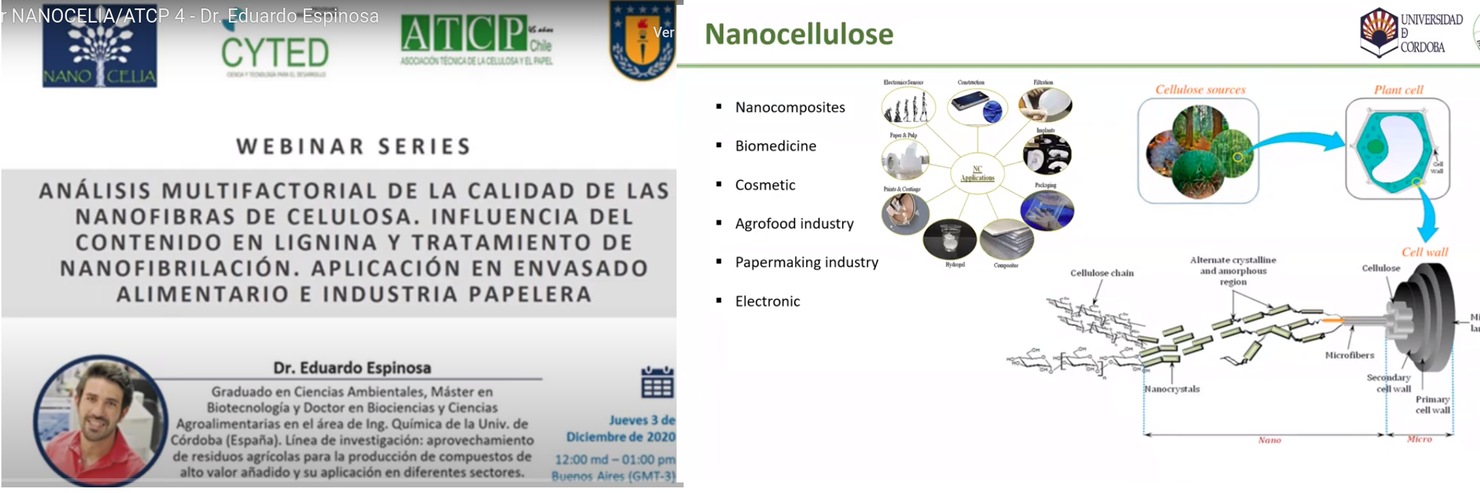 Seminario Virtual “Análisis multifactorial de la calidad de las nanofibras de celulosa. Influencia del contenido en lignina y tratamiento de nanofibrilación. Aplicación en envasado alimentario e industria papelera” presentado por Dr. Eduardo Espinosa Víctor de la Universidad de Córdoba (España).