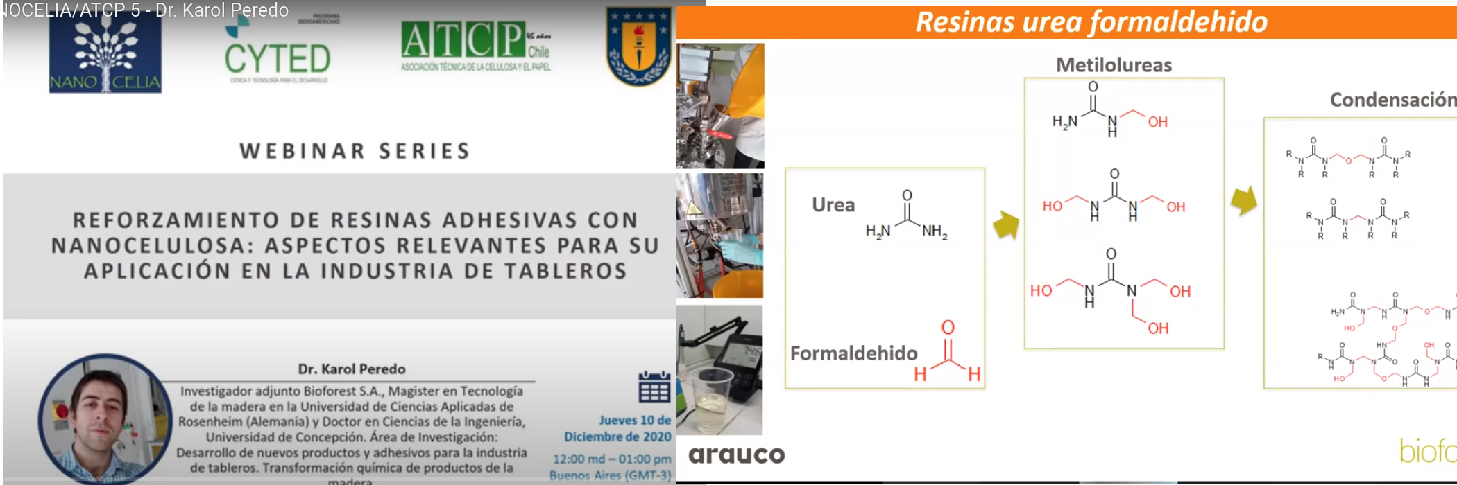 "Reforzamiento de resinas adhesivas con nanocelulosa. Aspectos relevantes para su aplicación en la industria de tableros" presentado por el Dr. Karol Peredo de Bioforest S.A. (Chile).