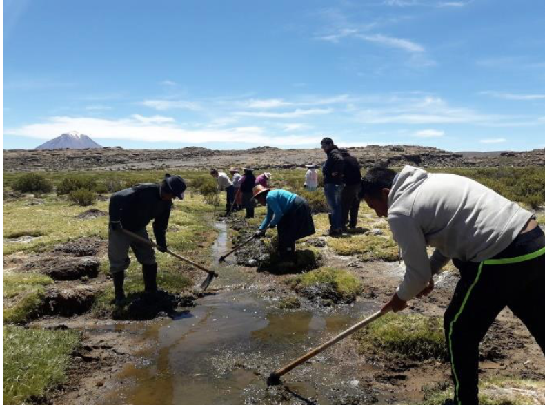Mantenimiento de canales de infiltracio?n de agua en un bofedal altoandino en la localidad de Turuna, Comuna de Colchane, Regio?n de Tarapaca? (Chile) Autor: Diego Aranibar Esteban/Iniciativa Mas Agua. Estos grandiosos humedales son mantenidos por las comunidades aymaras, aumentando mediante canales de infiltracio?n de agua la extensio?n de estas zonas de pasto y la capacidad de regulacio?n de estos sistemas, que descargan lentamente el agua infiltrada del deshielo de los nevados para mantener el caudal de manantiales y ri?os situados aguas abajo.