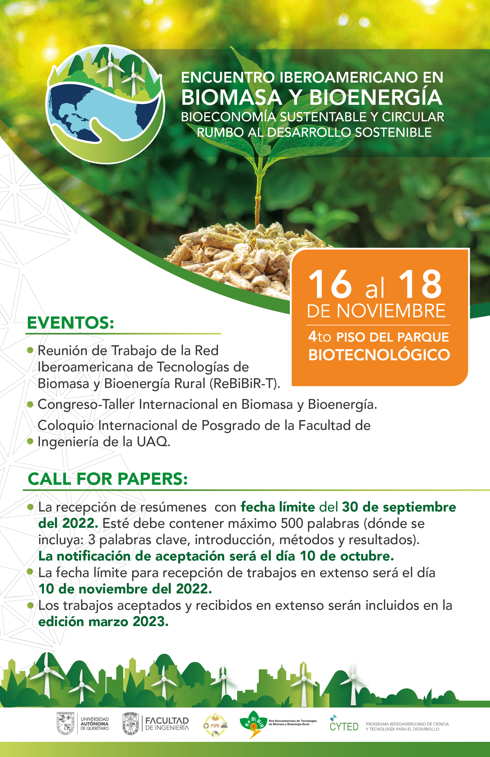 La Red Iberoamericana de Tecnologías de Biomasa y Bioenergía Rural (ReBiBiR-T) del Programa Iberoamericano de Ciencia y Tecnología para el Desarrollo (CYTED) y la Facultad de Ingeniería de la Universidad Autónoma de Querétaro (México), extienden esta cordial invitación a investigadores, profesores, estudiantes, consultores, profesionales, funcionarios, industriales y empresas, para participar en el: