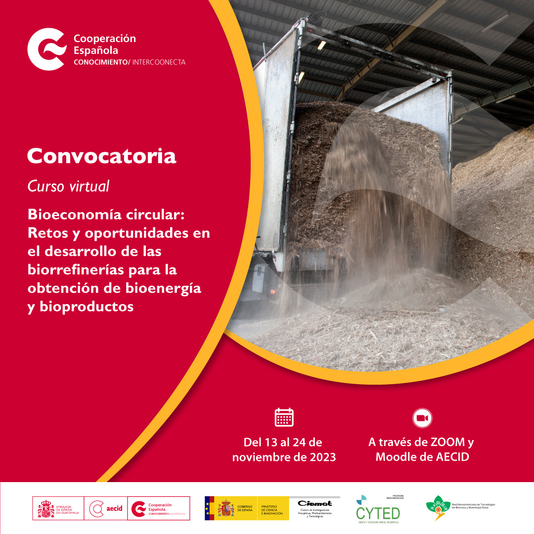En colaboración con el Centro de Investigaciones Energéticas, Medioambientales y Tecnológicas (CIEMAT) de España, se complace anunciar el curso virtual "Bioeconomía circular: Retos y oportunidades en el desarrollo de las biorrefinerías para la obtención de bioenergía y bioproductos". Este curso tiene como objetivo principal la creación de capacidades en el campo de la bioeconomía circular, con el fin de promover el fortalecimiento institucional y la implementación de proyectos que promuevan el acceso a energía sostenible, la adaptación al cambio climático y la mitigación de emisiones de CO2.