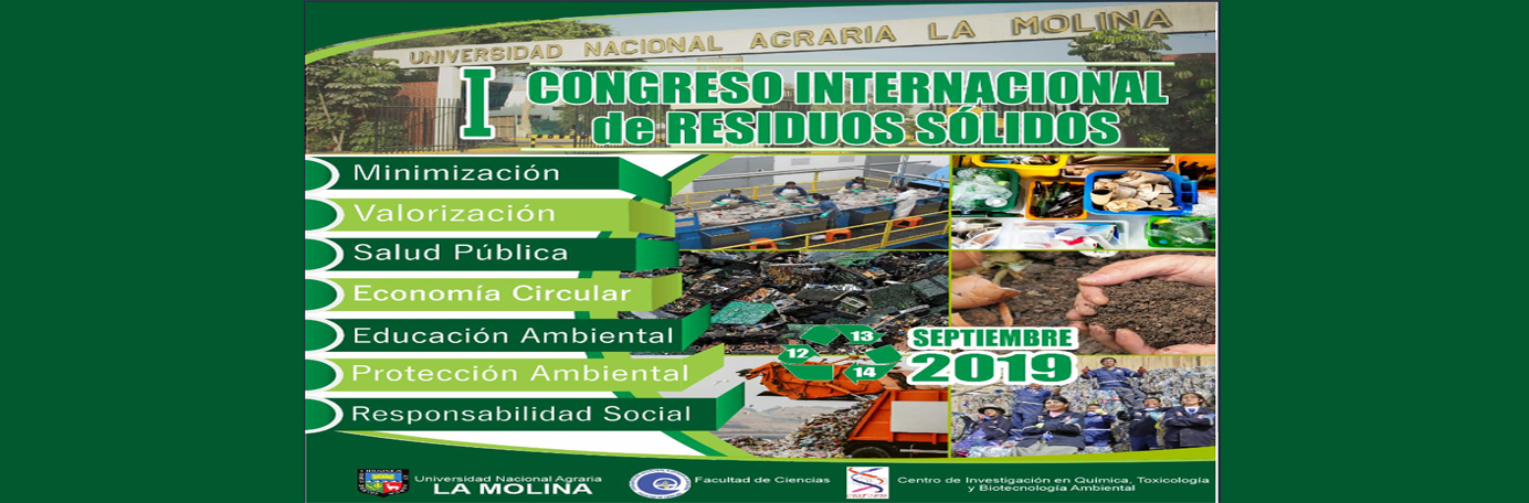 El Departamento Académico de Química, el Centro de Investigación en Química, Toxicología y Biotecnología Ambiental (CIQTOBIA) de la Facultad de Ciencias, convocan al I Congreso Internacional de Residuos Sólidos - Minimización, Economía circular, Valorización, Reutilización, Responsabilidad Social, Protección del ambiente, Educación ambiental y Salud Pública que tendrá lugar en el campus de la Universidad Nacional Agraria La Molina -UNALM del 12 al 14 de setiembre del 2019. En este evento académico tendremos la oportunidad de intercambiar, investigaciones, experiencias y avances relacionados en las diferentes áreas temáticas que nos convoca