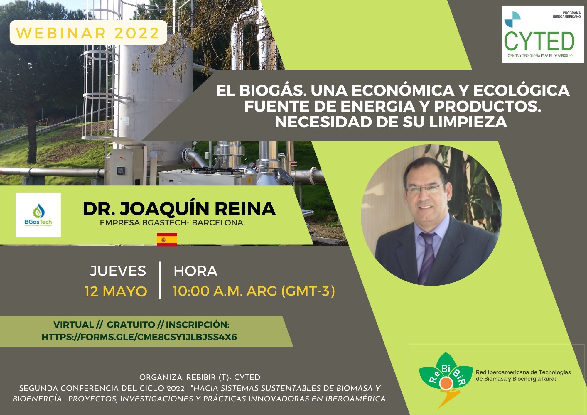 Es un placer invitarlos a registrarse para participar del segundo webinario de este ciclo 2022, que se transmitirá el JUEVES 12 DE MAYO a 10:00 a.m. hora Argentina. Se titula: "El biogás. Una económica y ecológica fuente de energia y productos. Necesidad de su limpieza " y estará a cargo del Dr Joaquín Reina de la empresa BGasTech, de Barcelona, España.