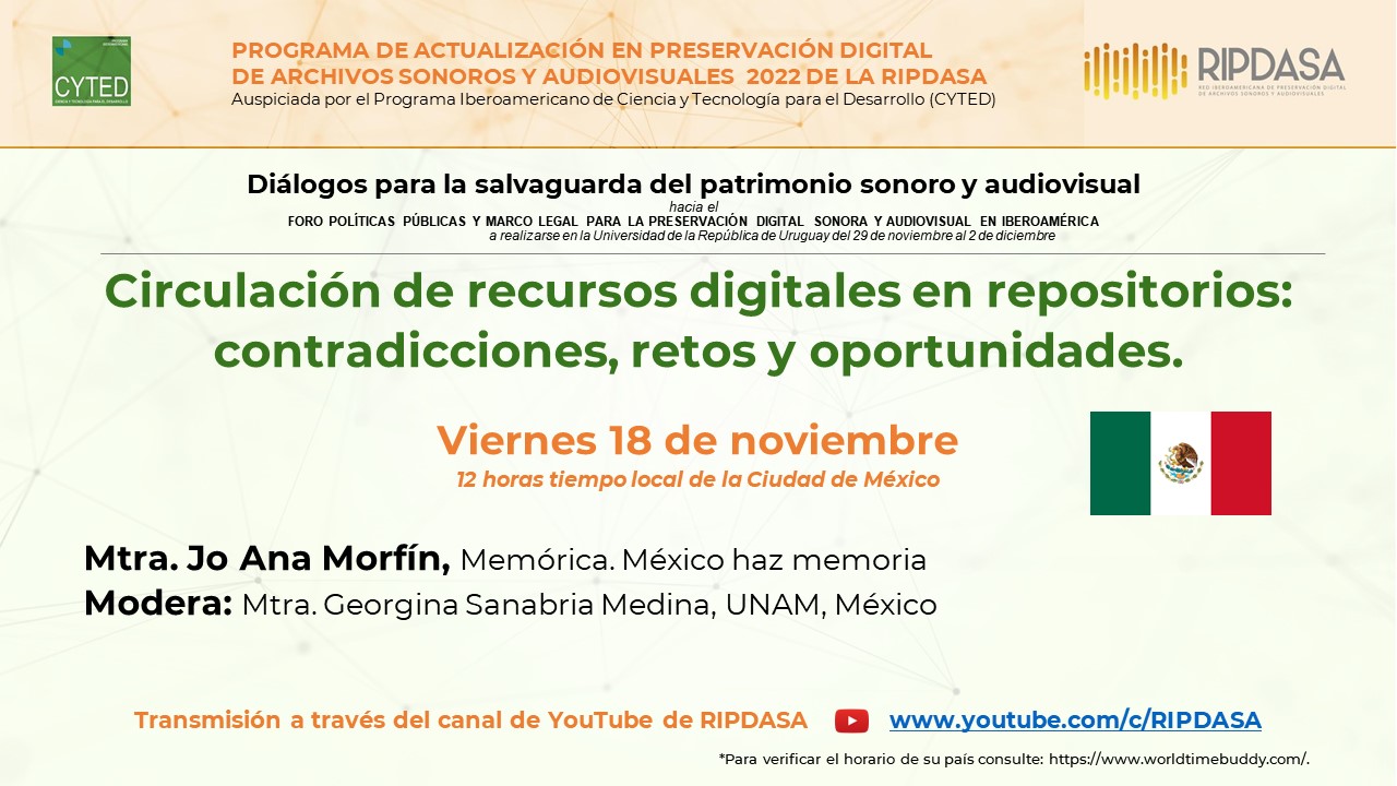"Circulación de recursos digitales en repositorios: contradicciones, retos y oportunidades" Mtra. Jo Ana Morfín, Memórica. México haz memoria Modera: Mtra. Georgina Sanabria Medina, UNAM, México. 12 horas tiempo local de la Ciudad de México www.youtube.com/c/RIPDASA