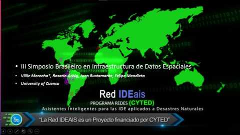 La red IDEAIS organiza una mesa redonda en el III Simposio Brasileño en Infraestructura de Datos Espaciales. En la misma participaron: Carlos Villie Morocho Zurita (Universidad de Cuenca - EC), Paloma Abad Power (Instituto Geográfico Nacional - IGN - ES), Homero Fonseca Filho (USP - BR) y Daniela Moctezuma Ochoa (CENTROGEO - MX). Además, la investigadora de la red Maria Ester Gonzalez de la Universidad de Concepción impartió la charla titulada "Infraestructura Espacial del Conocimiento: un Concepto que va más allá de las IDE". Enlace a la Web del congreso: https://inde.gov.br/simposio-14-anos/
