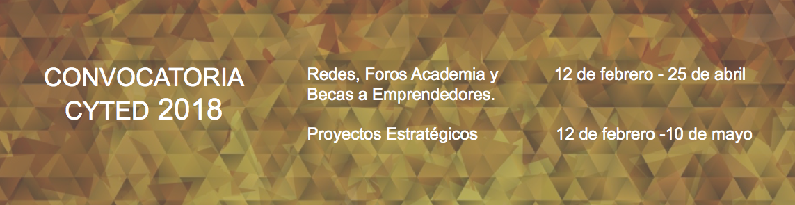 El Programa CYTED abrirá desde el 12 de febrero la convocatoria 2018 para la presentación a Redes Temáticas, Proyectos en Temas Estratégicos, Foros CYTED y este año se incluye un nuevo instrumento que consiste en el apoyo a emprendedores en parques científicos. La convocatoria a Redes, Foros Empresa Academia y Becas a Emprendedores permanecerá abierta hasta el próximo 25 de abril y en el caso de los Proyectos en Temas Estratégicos que permanecerá abierta hasta el 10 de mayo. La evaluación se desarrollará a través de evaluación por expertos con la revisión de los Comités de Área.