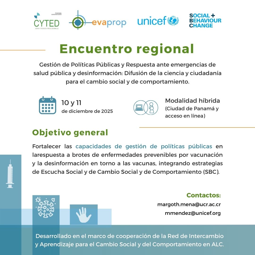 Este evento, co-organizado por UNICEF LACRO y la Red EVAPROP/CYTED, en el marco de la Red de Intercambio y Aprendizaje para el Cambio Social y de Comportamiento en ALC, busca capitalizar las lecciones