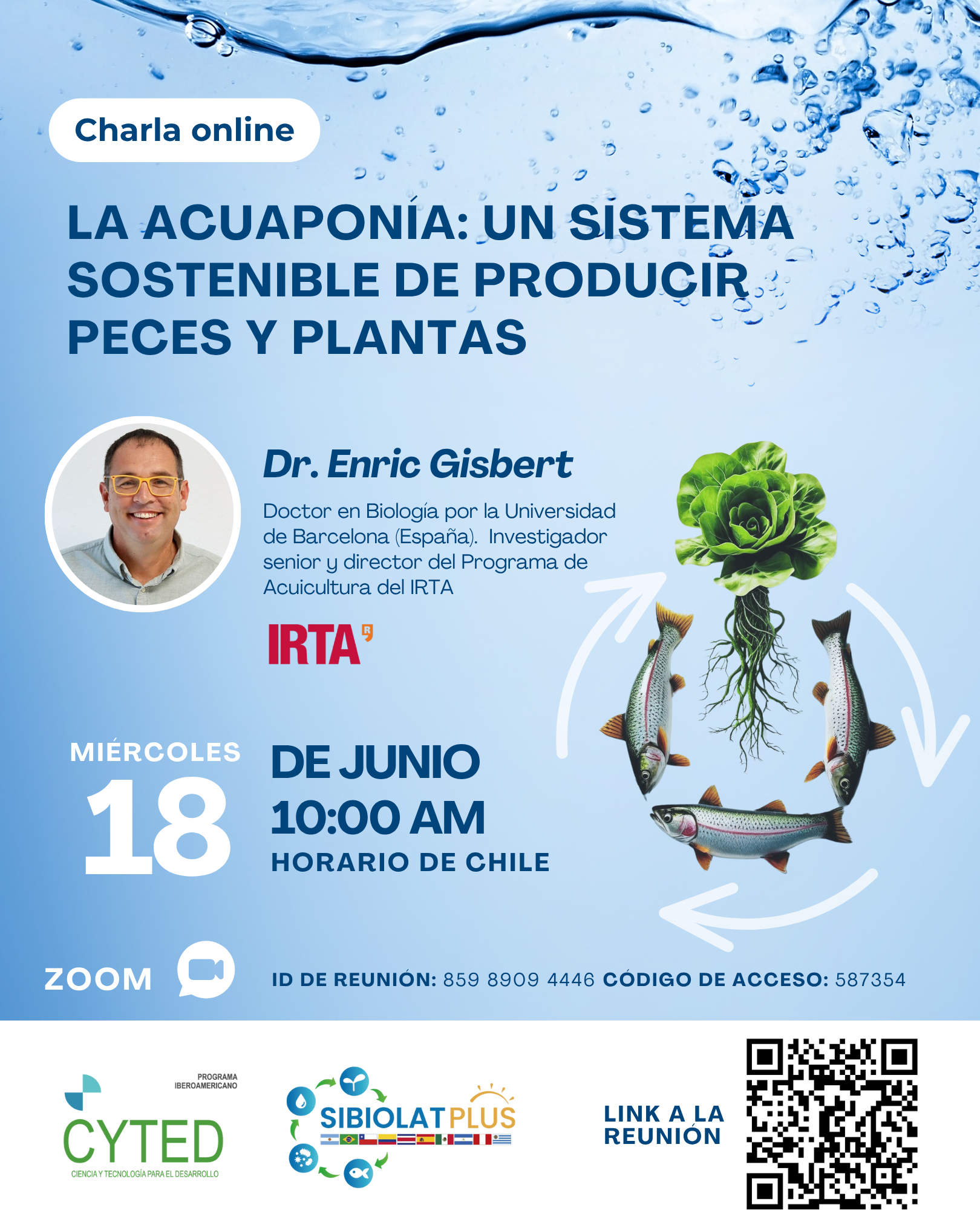 Los invitamos a participar de la charla online "La acuaponía: un sistema sostenible de producir peces y plantas", dictada por el Dr. Enric Gisbert del IRTA, Doctor en Biología por la Universidad de Ba