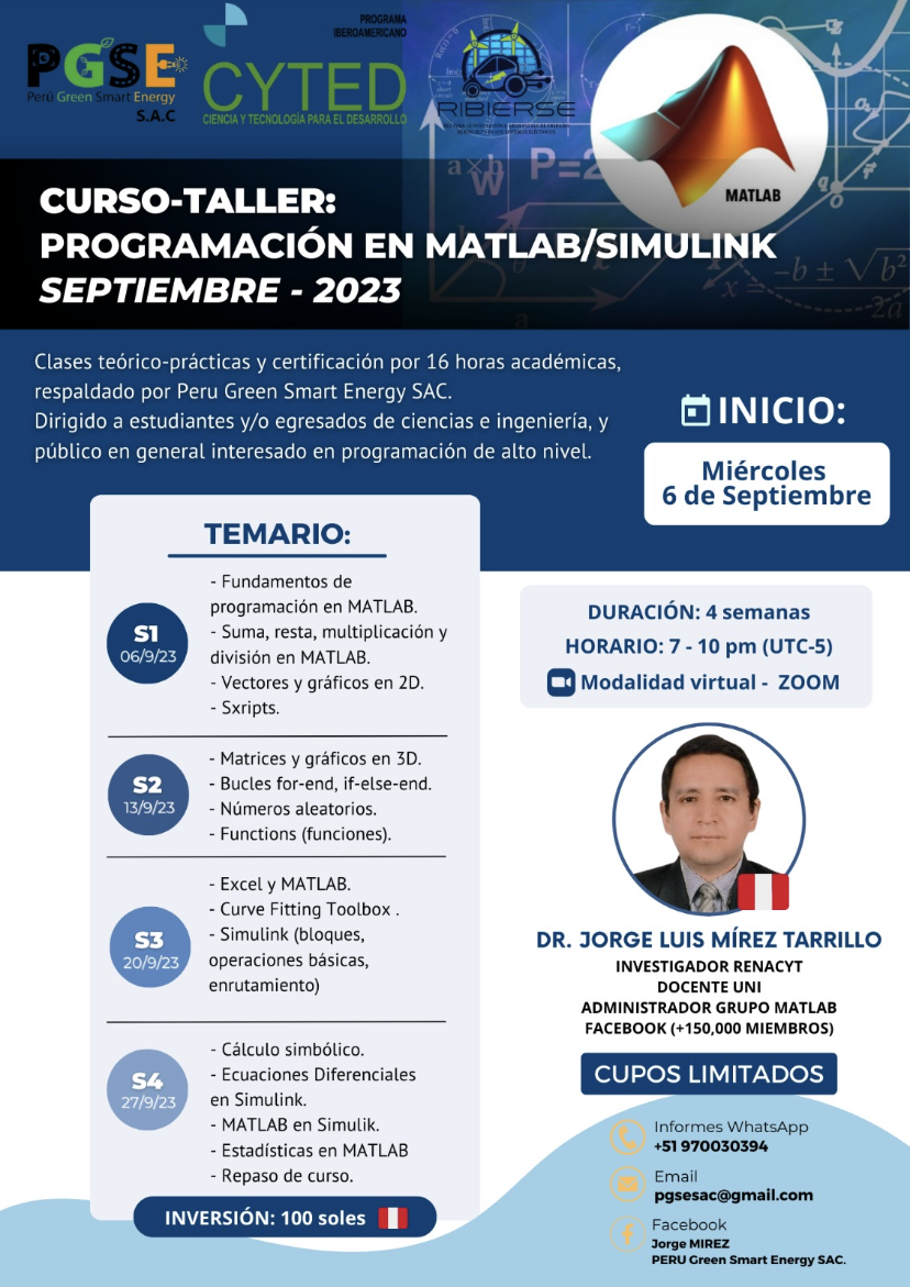 Curso-Taller: "Programación en MATLAB/ Simulink - Septiembre 202311 Inicio Miércoles 06 de setiembre del 2023. Clases virtuales en vivo (Zoom). La grabación, códigos, PPT y apuntes de clase serán comp