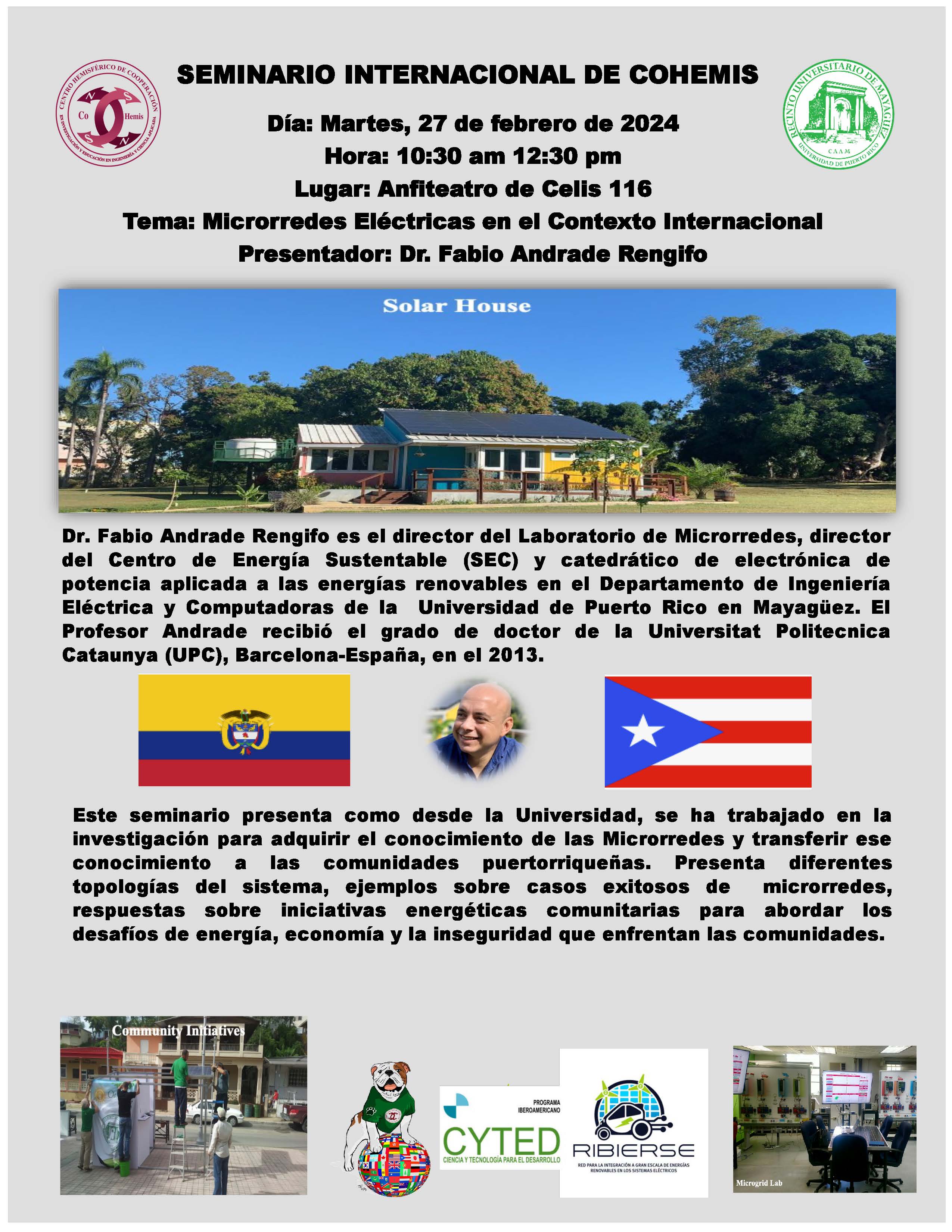 El Seminario: "Microrredes Eléctricas en el Contexto Internacional" se llevará a cabo el martes 27 de febrero de 2024 a las 10:30 am (UTC -4:00) en la Universidad de Puerto Rico, recinto de Mayagüez y