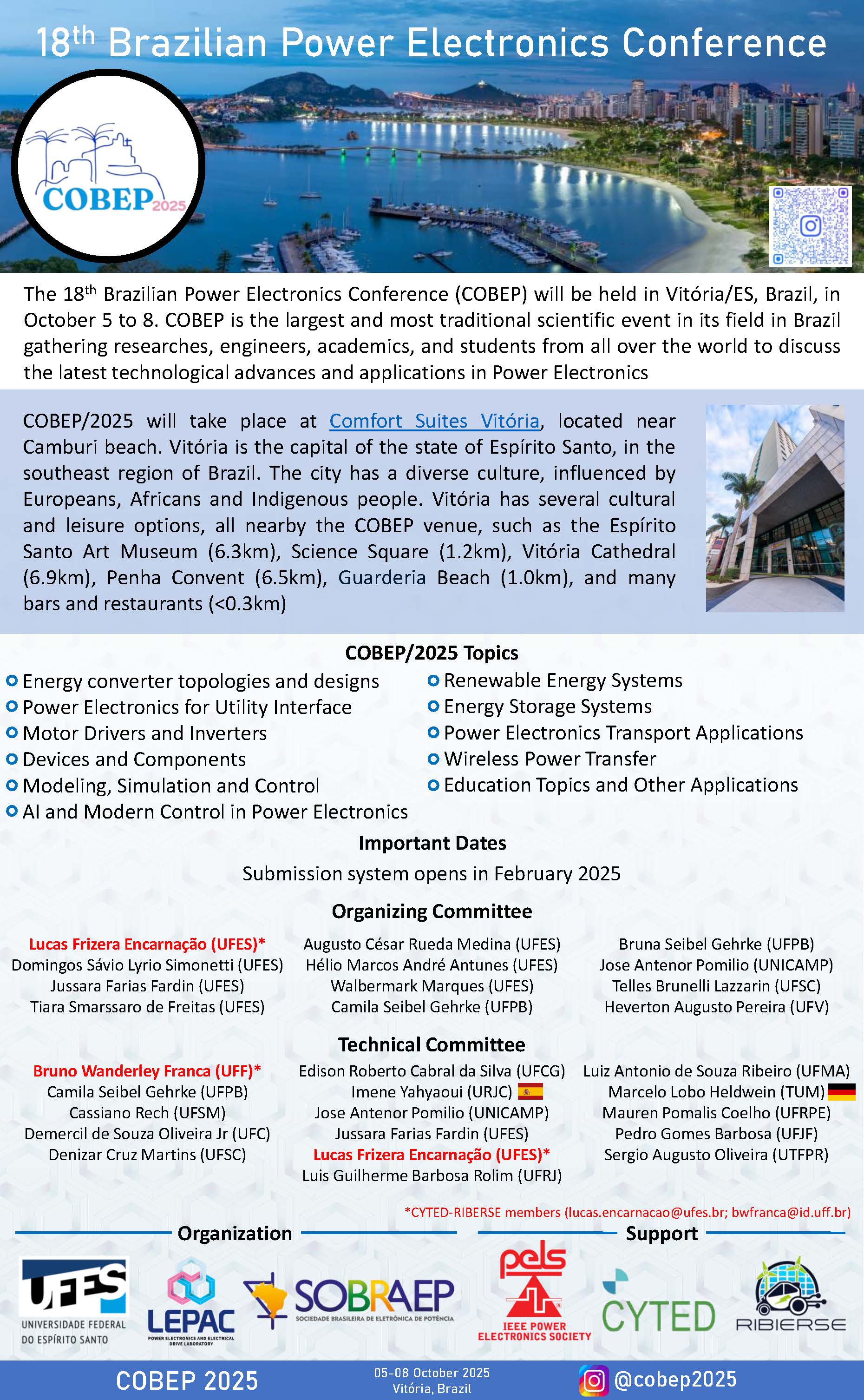 The 18th Brazilian Power Electronics Conference (COBEP) will be held in Vitória/ES, Brazil, in October 5 to 8. COBEP is the largest and most traditional scientific event in its field in Brazil gatheri