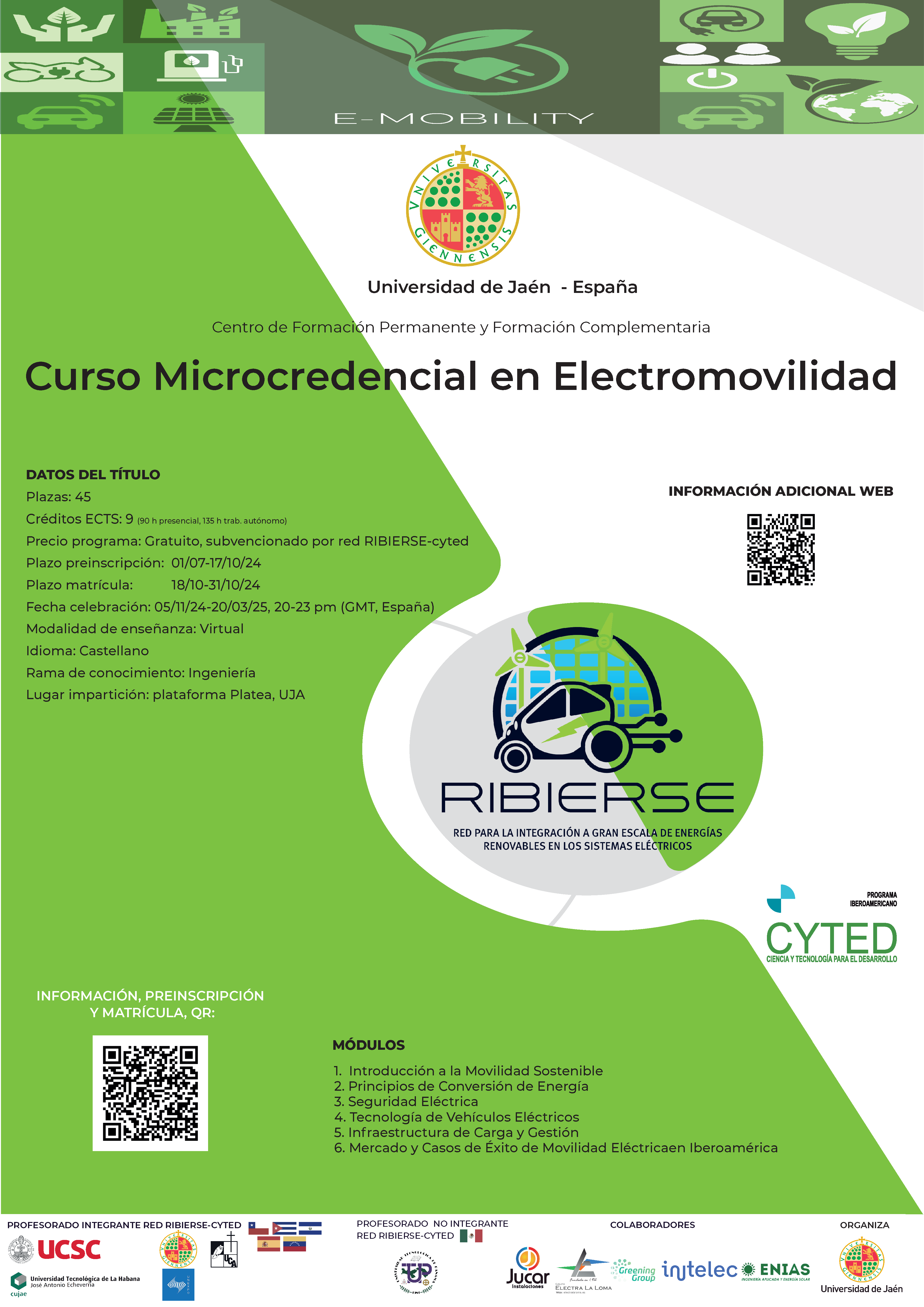 La Universidad de Jaén con el apoyo de la red RIBIERSE-CYTED organiza este curso Microcredencial en Electromovilidad, que se va a celebrar desde el próximo 5 de noviembre de 2024 a 20 de marzo de 2025