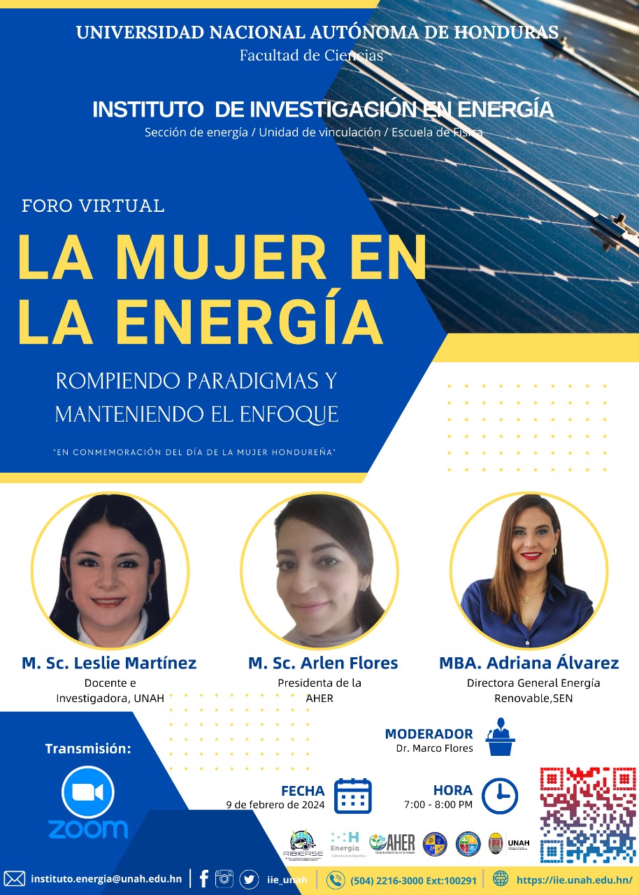 El viernes 09 de febrero de 2024 la UNIVERSIDAD NACIONAL AUTÓNOMA DE HONDURAS (Facultad de Ciencias) y su INSTITUTO DE INVESTIGACIÓN EN ENERGÍA efectuaron el foro virtual titulado LA MUJER EN LA ENERG