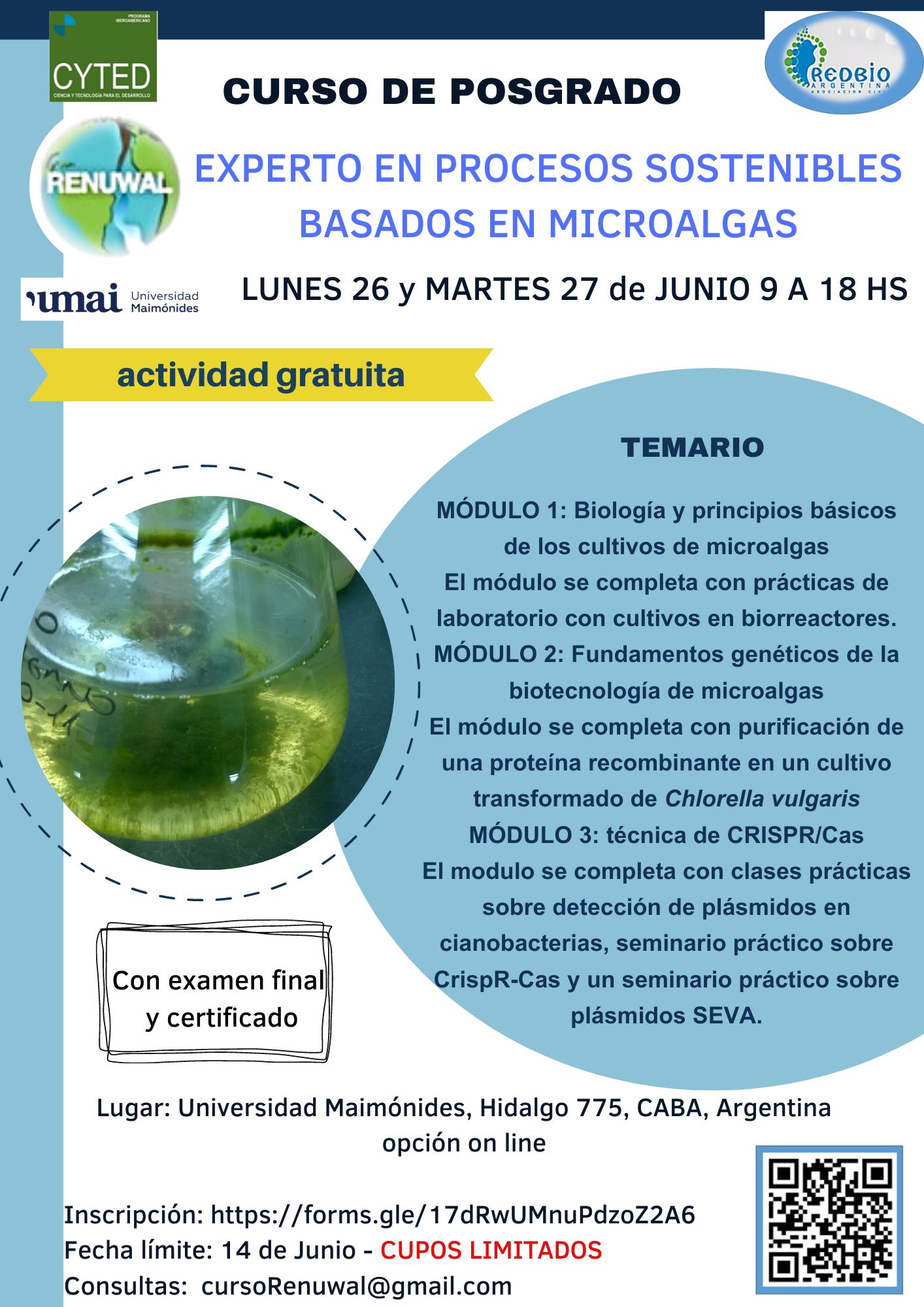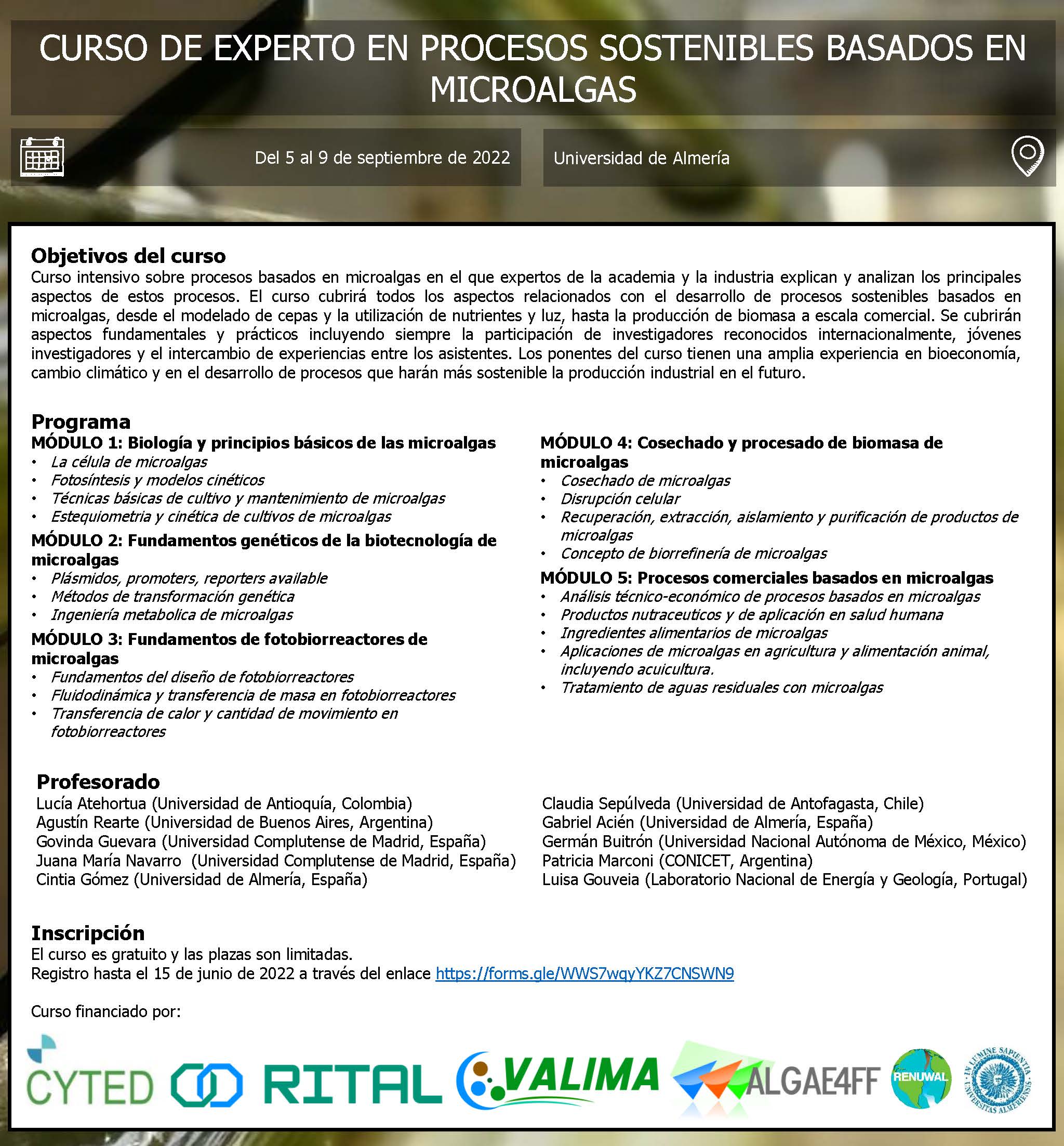 Curso de formación en Biotecnología de microalgas - Estrategias biotecnológicas aplicadas a microalgas y cianobacterias para la obtención de valor agregado