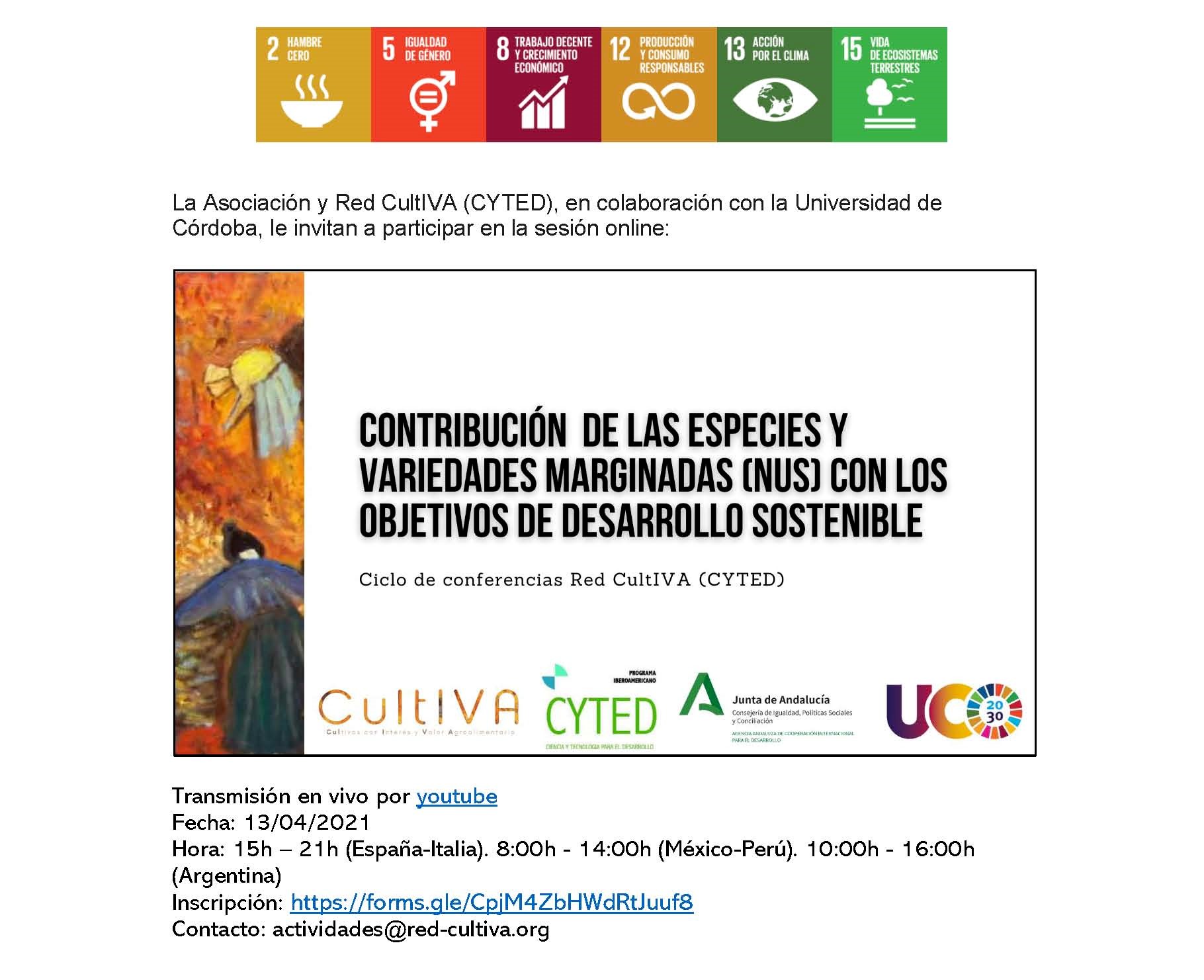 La Red CultIVA, en colaboración con la Universidad de Córdoba, le invitan a participar vía telemática a la sesión online: Contribución de las especies y variedades marginadas (NUS) con los objetivos d