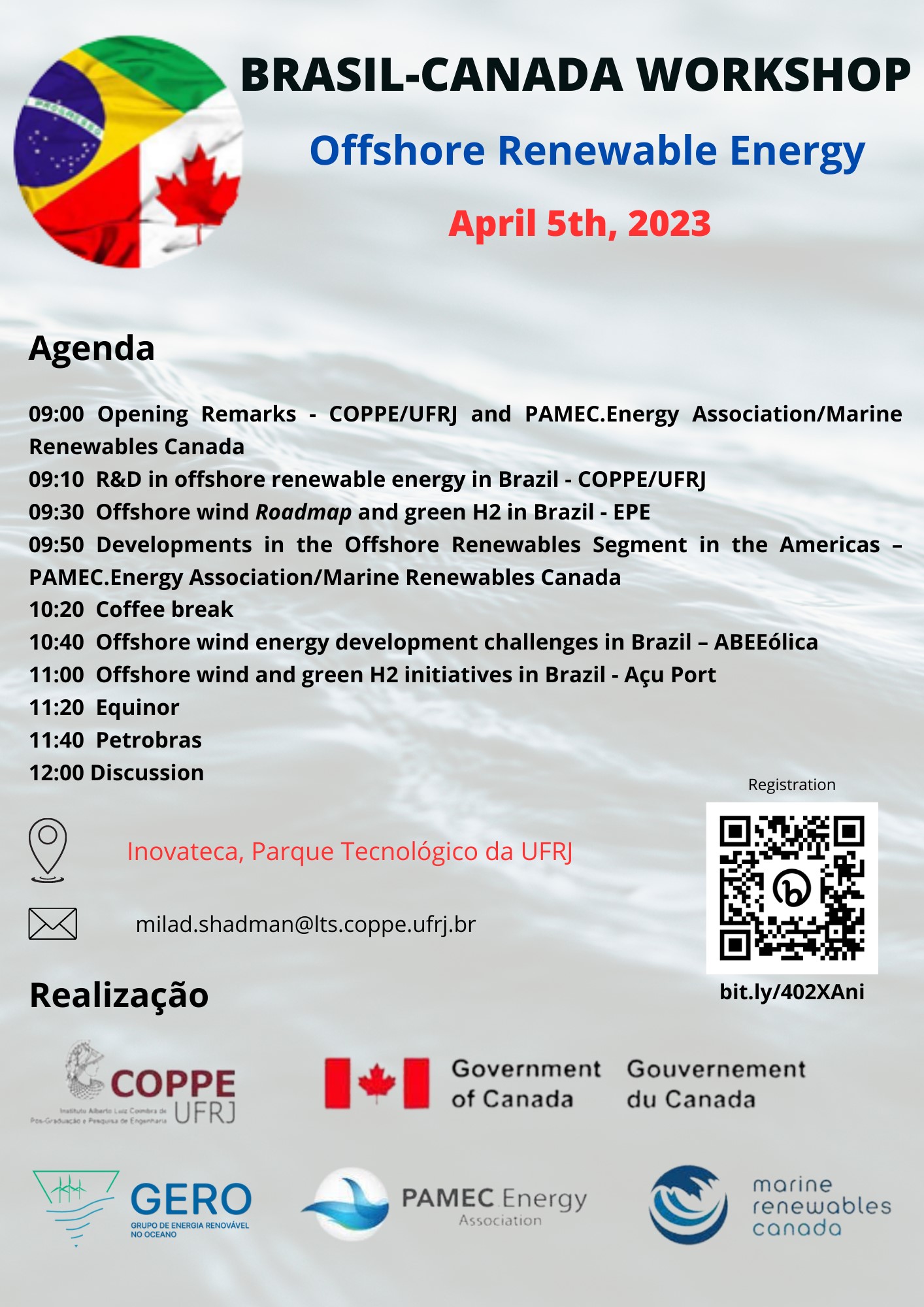 Les adjuntamos el cartel del Workshop "Offshore Renewable Energy Brasil-Canada que nos envía el compañero investigador y profesor asociado de la Universidade