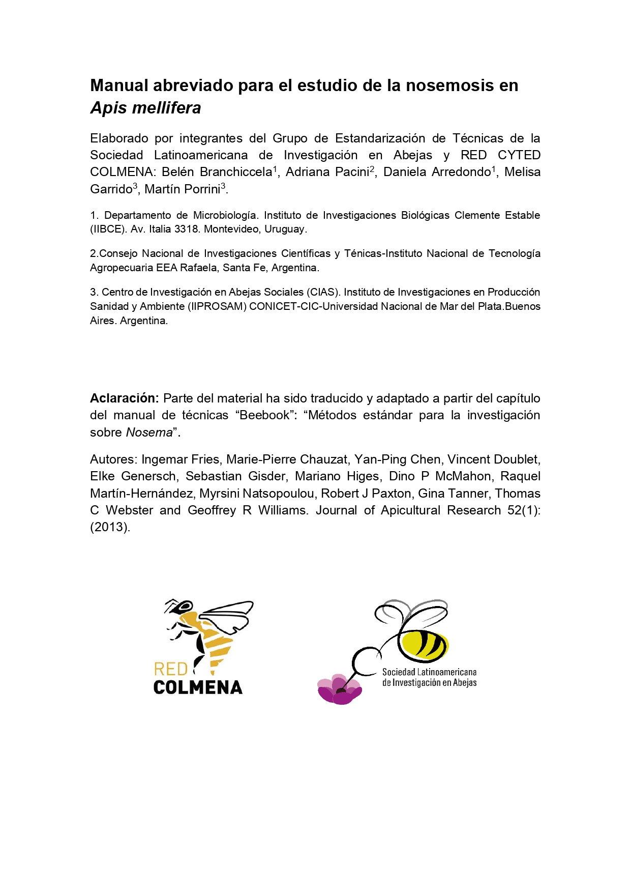 Documentos con formato de guía técnica para el monitoreo y análisis estandarizado de plagas y patógenos que afectan a la producción apícola “Manual abreviado para el estudio de la nosemosis en Apis me