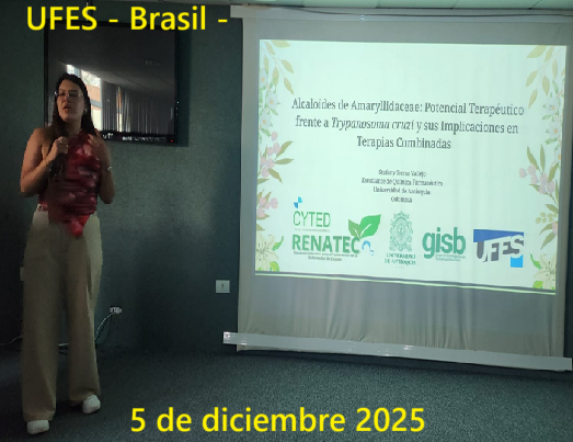 En el marco de la tematica que se desarrolla en la RED RENATEC Area Salud CYTED, la movilidad desde el grupo de Colombia (que coordinan Dr Edison Osorio y Omar Triana), la presentacion estuvo relacionada a los avances recientes sobre el estudio y potencial bioactivo de los alcaloides de amarilidaceas para encontrar moleculas que tengan potencial bioactivo frente al parasito implicado en la Enfermedad de Chagas. Comento sobre resultados, metodos aplicados y el aislamiento y elucidacion de las moleculas identificadas.