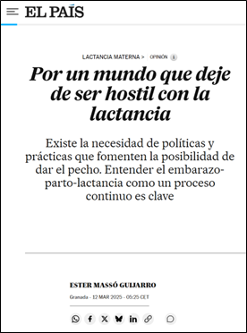 Nuestra compañera Ester Massó Guijarro, investigadora de FiloLab y miembro de ESPACyOS y LIBERESP, ha publicado en el diario EL PAÍS un artículo de opinión en el que reivindica la lactancia materna co