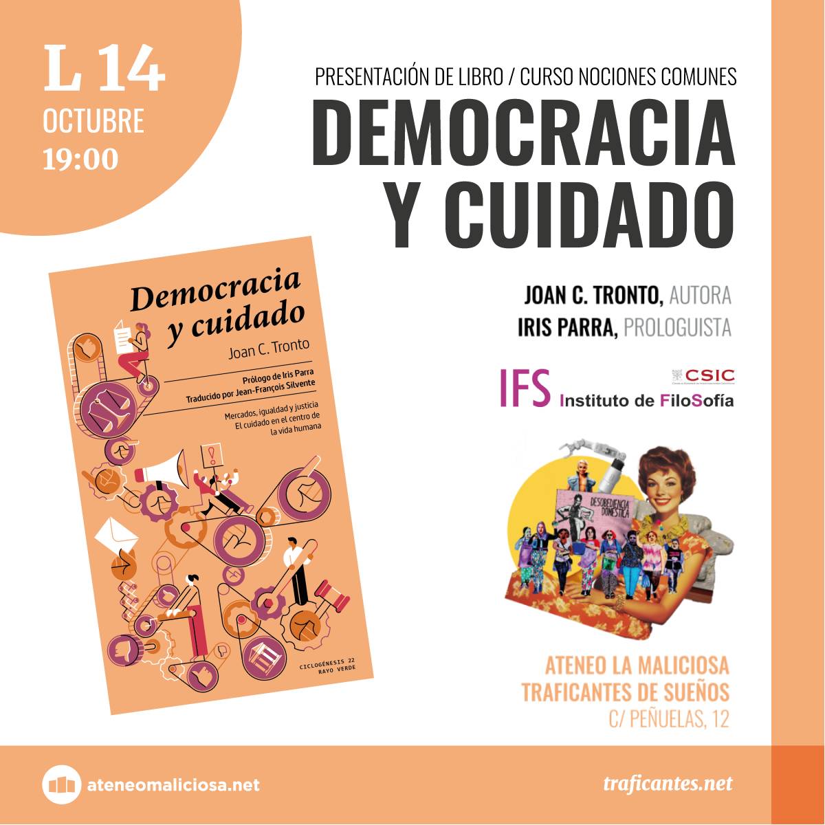 El próximo lunes 14 de octibre a las 19,00h, Joan Tronto presenta su libro Democracia y cuidado. La presenta, Iris Parra del grupo ESPACyOS (nodo España de LIBERESP). También el jueves 17 de octubre J
