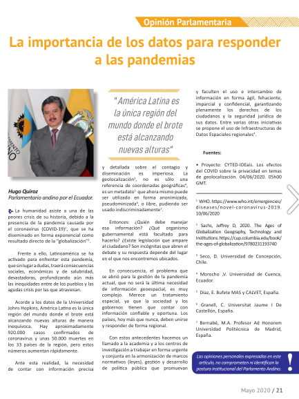 El panel organizado por la red IDEAIS sobre los efectos de la COVID en temas de privacidad de datos y geolocalización tiene repercusión en el Parlamento Andino. Así lo recoge la Revista El Cóndor nº 9