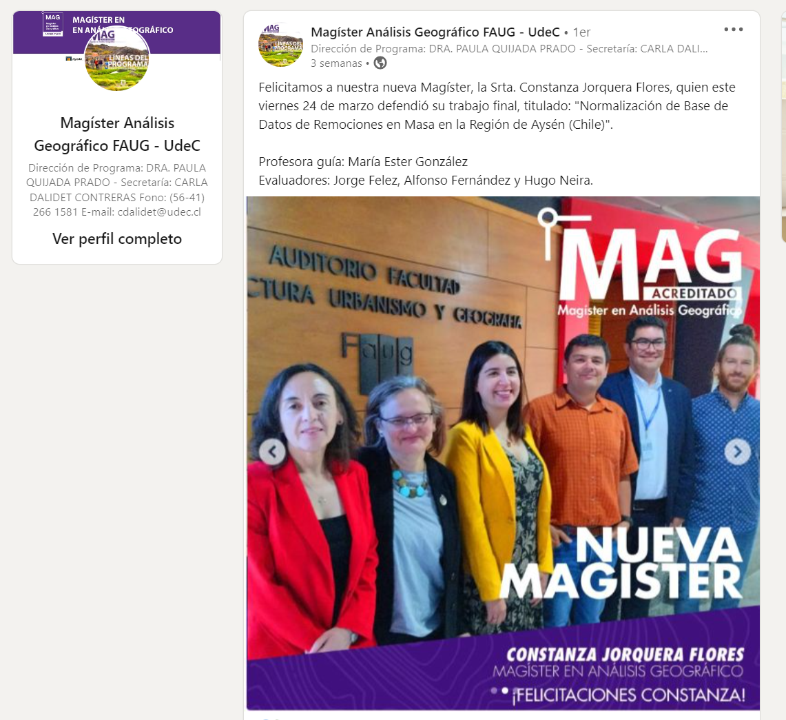 Constanza Jorquera Flores, estudiante del Magíster de Análisis Geográfico de la Universidad de Concepción e investigadora de la red IDEAIS, defendió exitosamente su tesis de magíster el 24 de marzo de